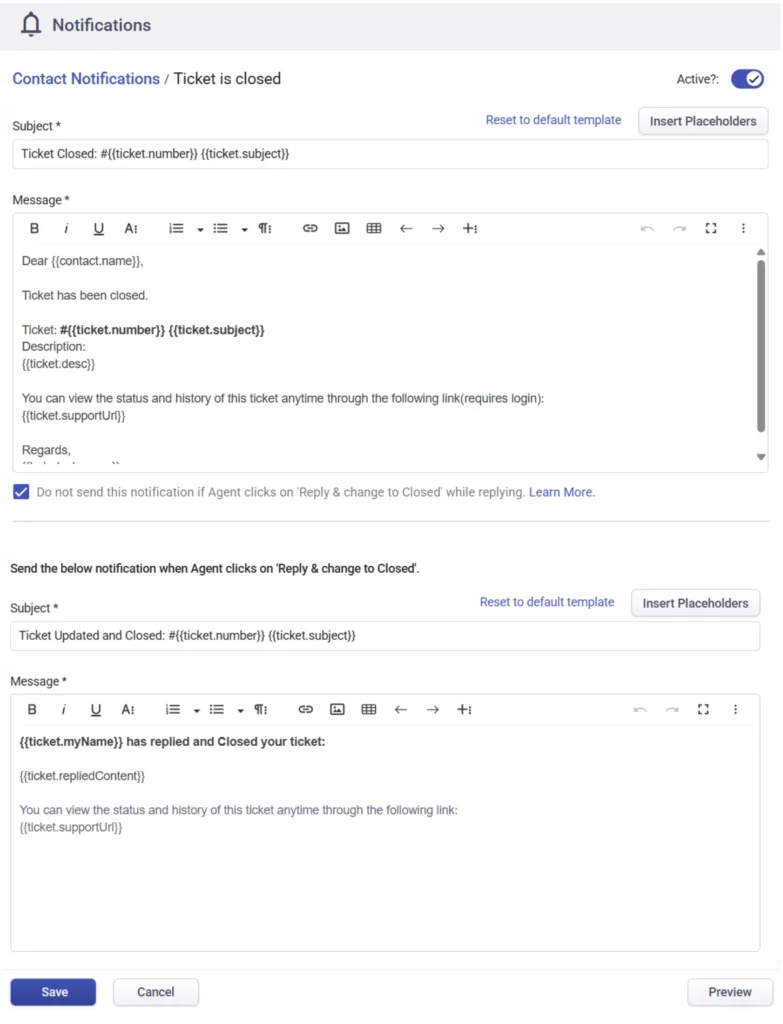You can also preview both templates, the standard ticket closed notification and the reply & close version, to see exactly how each will appear to requesters.
