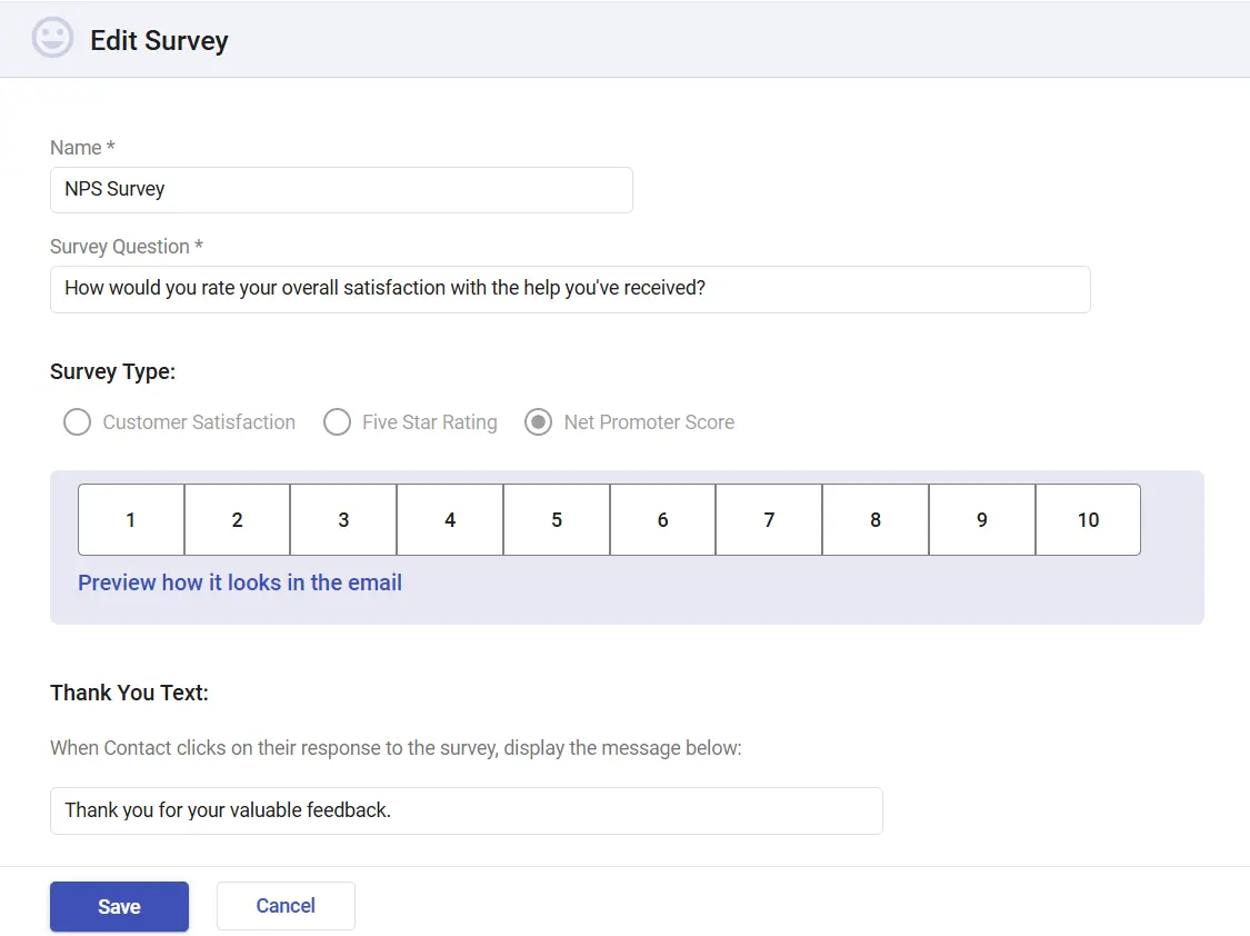 - Variety of survey types: Desk365 offers Customer Satisfaction (CSAT), Star Rating, and Net Promoter Score (NPS) surveys.Â