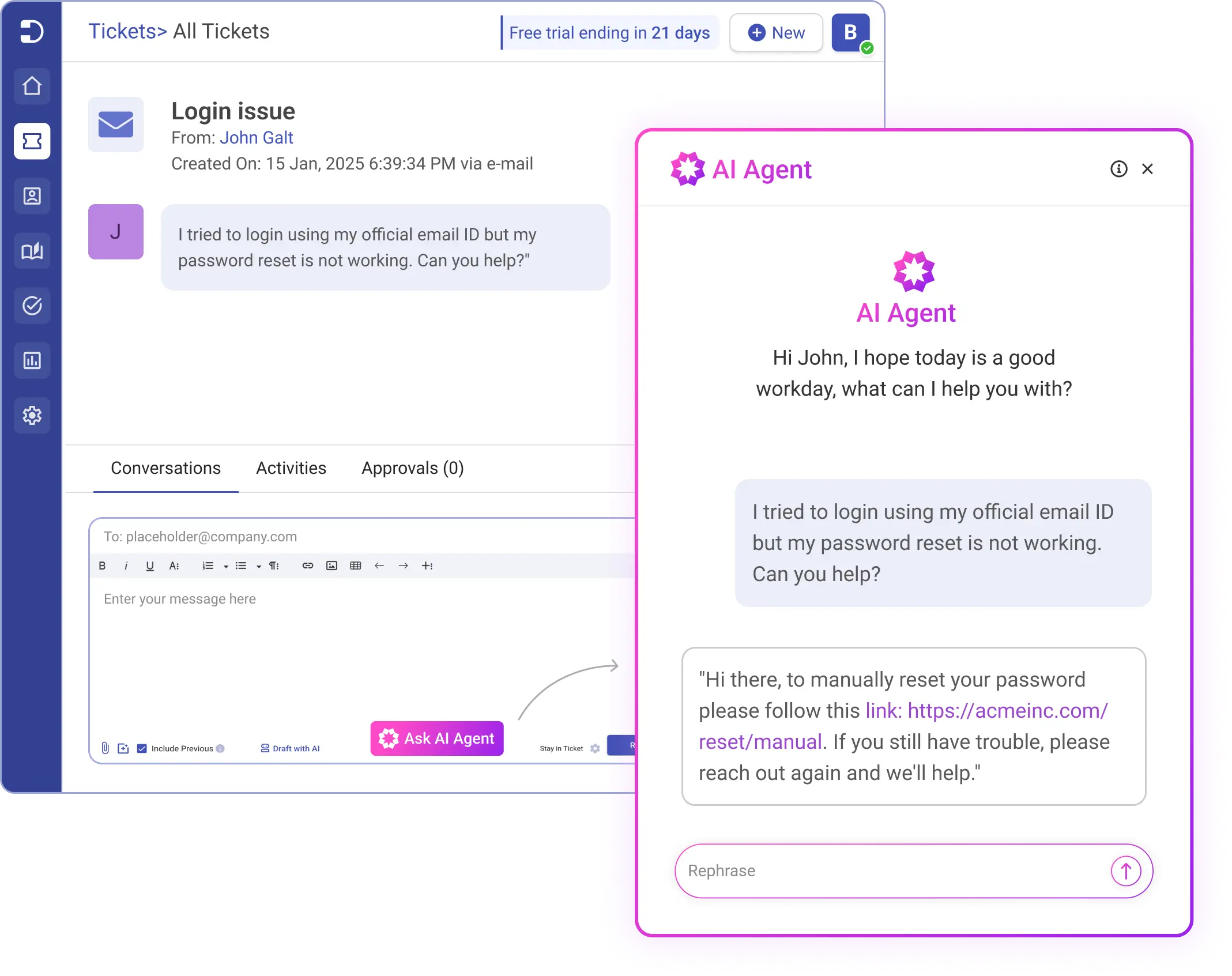 Ein individueller KI-Agent, der auf den historischen Daten Ihres Unternehmens basiert. Der Desk365 KI-Agent lernt aus Ihren Tickets und Wissensdatenbankartikeln, um präzise Antworten zu generieren – damit Ihre Mitarbeiter Tickets schneller abschließen können.