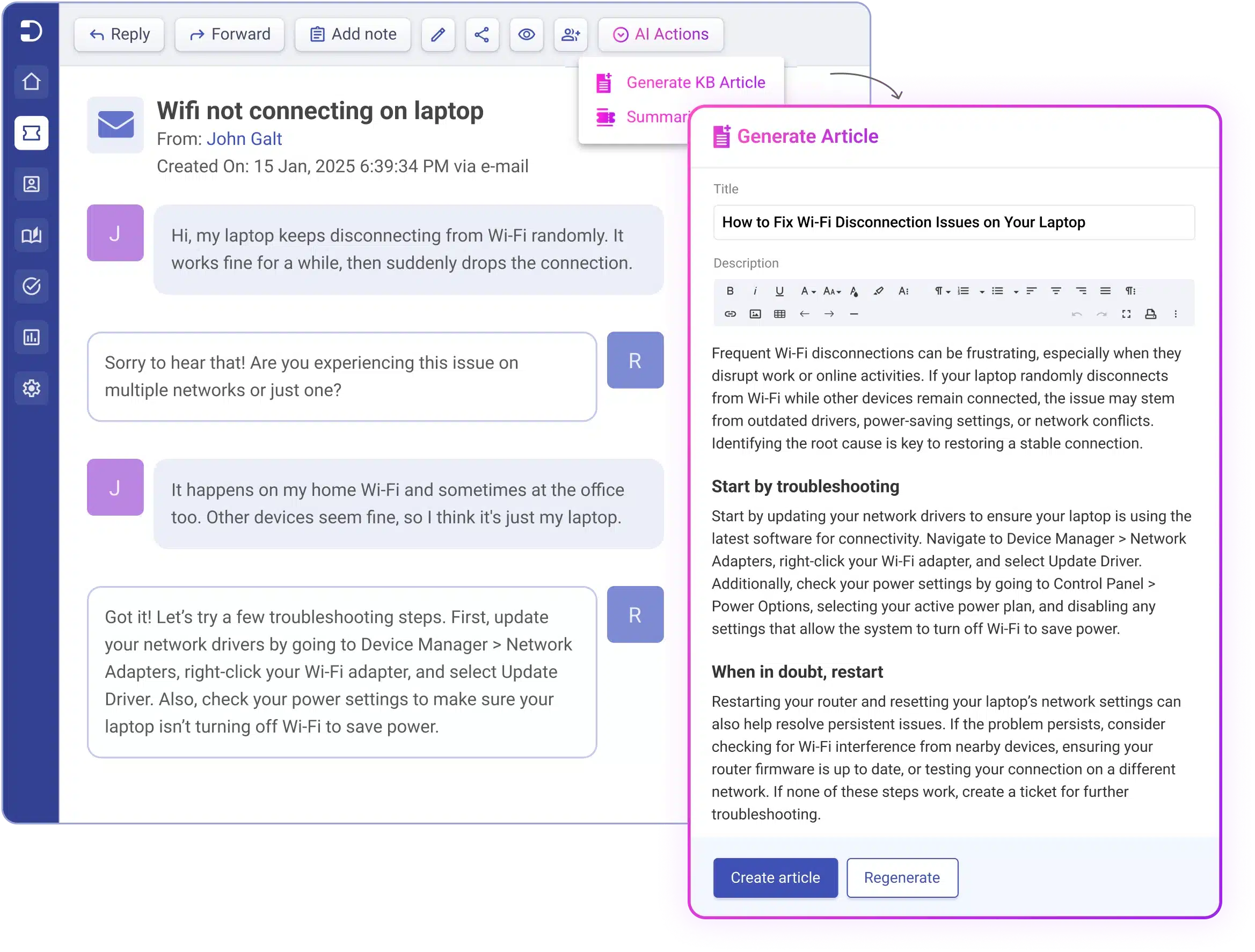 Wandeln Sie Ticketkonversationen mithilfe von KI mühelos in detaillierte, strukturierte Wissensdatenbankartikel um. Desk365 extrahiert intelligent wichtige Informationen aus Kundeninteraktionen, formatiert sie übersichtlich und hilft Ihnen so, Ihre Wissensdatenbank zu erweitern.